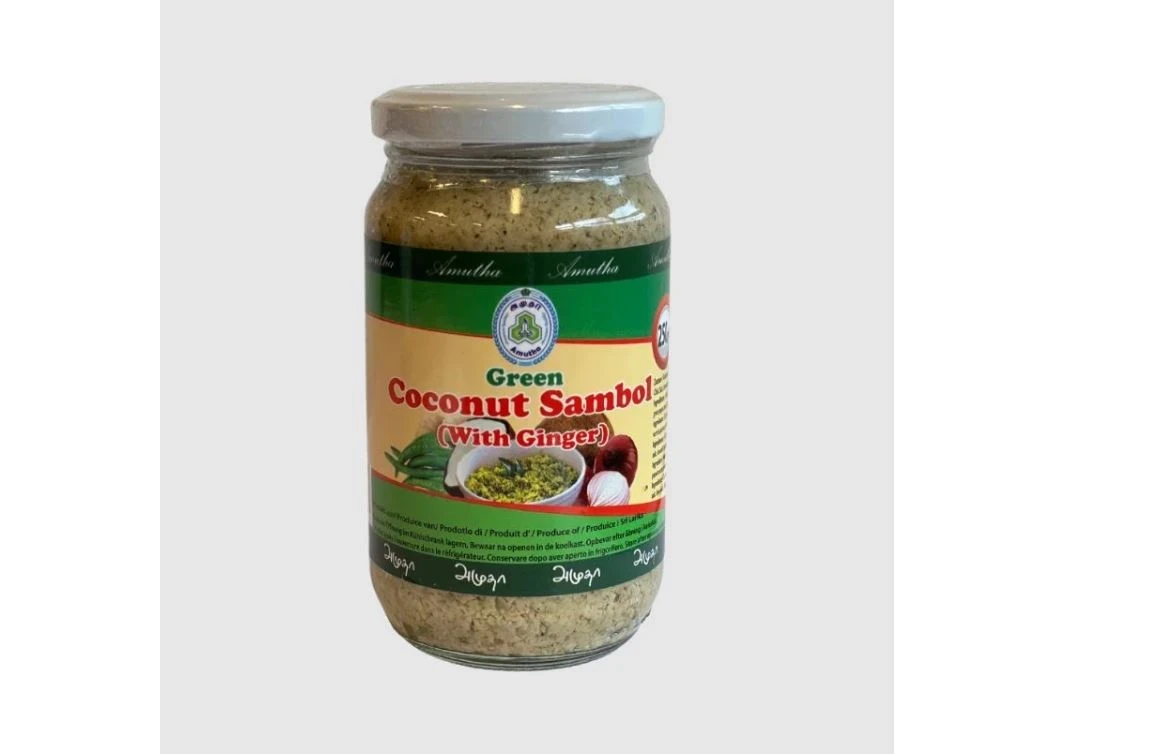 AMUTHA Green Coconut Sambol with Ginger 250 g to tradycyjny lankijski dodatek do potraw, łączący świeżość kokosa z pikantnością papryczek chili i aromatycznym imbirem. Ten wszechstronny sambol doskonale komponuje się z różnorodnymi daniami, dodając im egzotycznego charakteru.