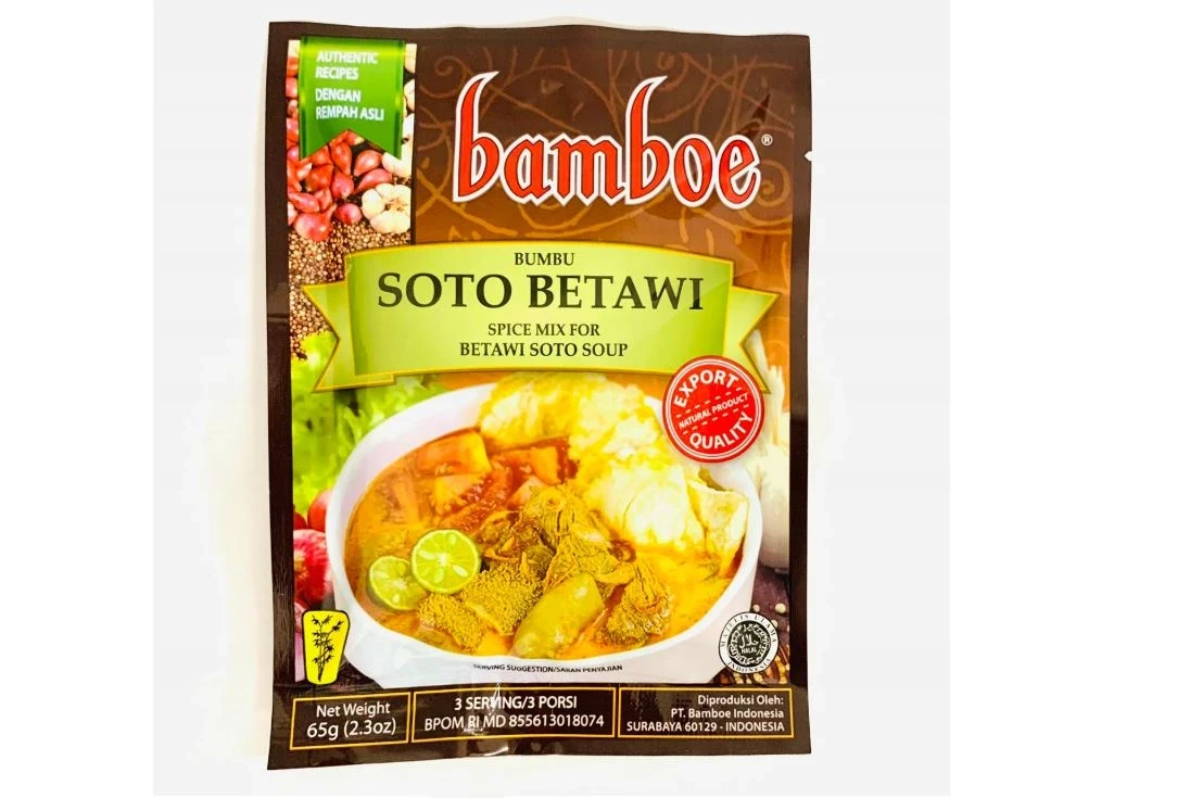 Bamboe Soto Betawi to indonezyjska przyprawa instant, która umożliwia przygotowanie tradycyjnej zupy Soto Betawi, charakterystycznej dla społeczności Betawi z Dżakarty. Ta zupa, popularna w zachodniej Jawie, wyróżnia się bogatym smakiem uzyskanym dzięki połączeniu przypraw z mlekiem kokosowym. Głównymi składnikami są wołowina oraz podroby, gotowane w aromatycznej mieszance przypraw, a następnie podawane z smażonymi plasterkami ziemniaków i świeżo pokrojonymi pomidorami. Tradycyjnie zupę spożywa się z ketupat lub lontong, czyli sprasowanym ryżem owiniętym w liście bananowca.