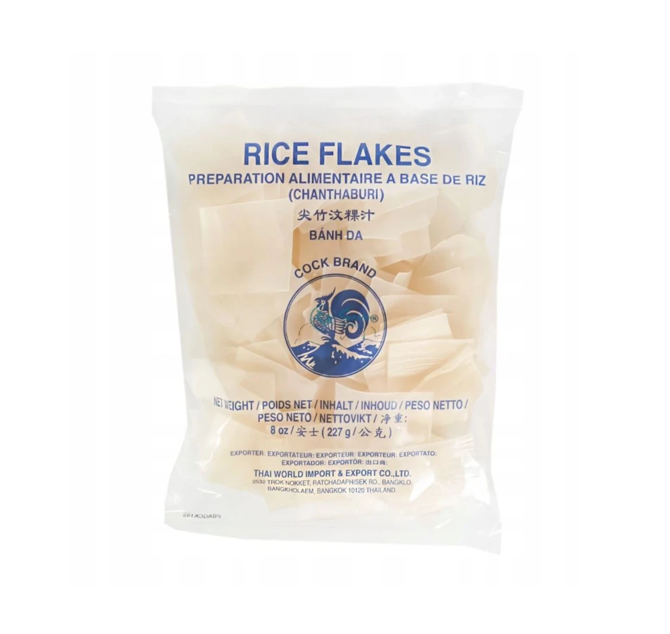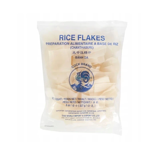 Cock Rice Flakes to produkt pochodzący z Tajlandii, oferowany w opakowaniu 227 g. Są to cienkie płatki ryżowe, znane również jako Banh Cuon Kho, które stanowią popularny składnik w kuchni azjatyckiej.