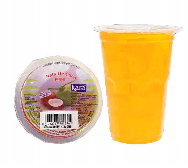 KARA Nata de Coco Mango to wyjątkowa przekąska – miękkie, sprężyste kostki galaretki kokosowej zanurzone w soczystym, owocowym syropie mango. Idealne jako deser, dodatek do napojów lub element egzotycznej przyjemności w codziennym menu!