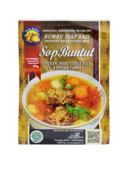 DUA KUALI Bumbu Sop Buntut to tradycyjna mieszanka przypraw do przygotowania słynnej zupy z ogona wołowego – jednej z najbardziej cenionych potraw kuchni indonezyjskiej. Głęboki smak, aromatyczny bulion i egzotyczna kompozycja ziół sprawiają, że to danie zachwyca już od pierwszej łyżki.