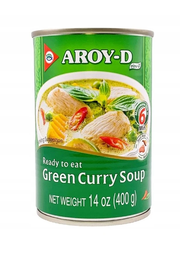 AROY-D GREEN CURRY SOUP 400 ml to gotowa, autentyczna tajska zupa na bazie zielonego curry. Łączy w sobie intensywny smak zielonej pasty curry, mleka kokosowego oraz aromatycznych przypraw, tworząc bogaty i pikantny bulion. Produkt pochodzi od renomowanej marki AROY-D, cenionej za wysoką jakość składników i oryginalne receptury kuchni tajskiej.